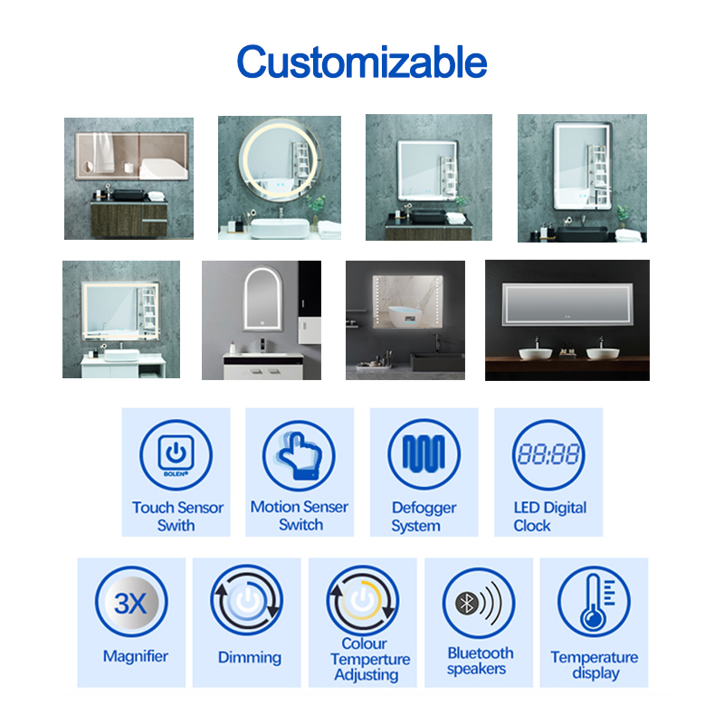 | Function options | Dimmable, touch switch, defogger, time/temperature, Bluetooth (music), magnifier |
