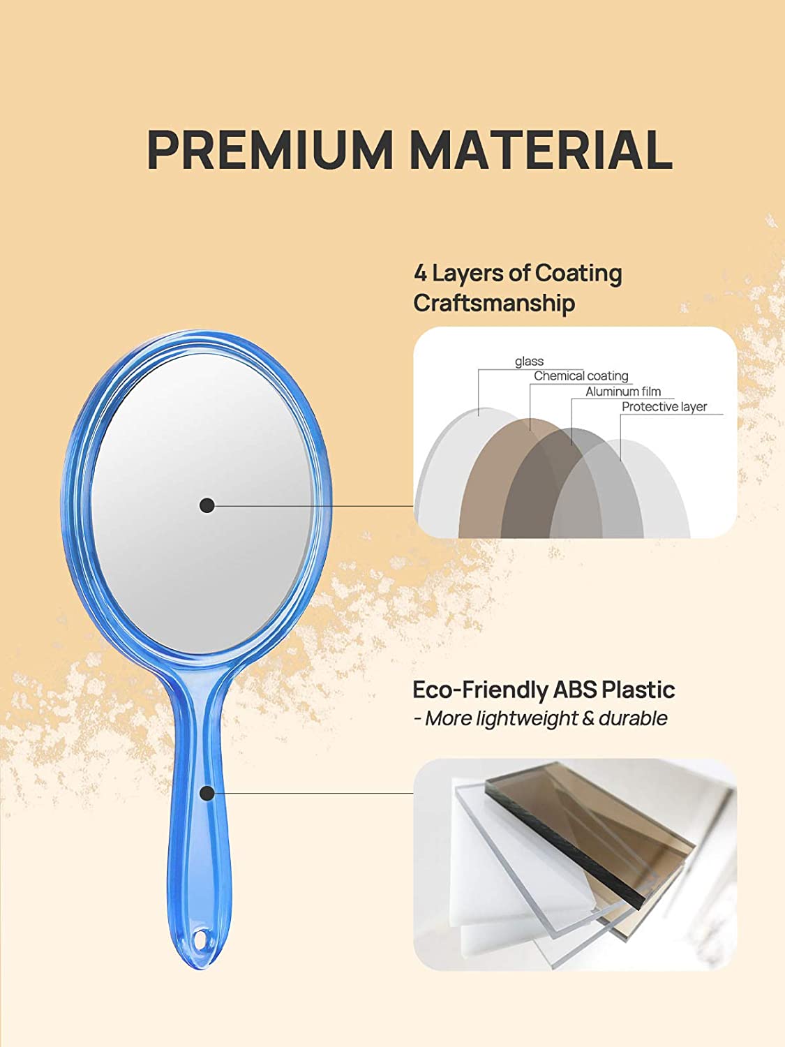 【PREMIUM HANDHELD MIRROR】: 4 layers of coating craftsmanship for better reflection. Adopts eco-friendly thickened ABS plastic to be more durable.