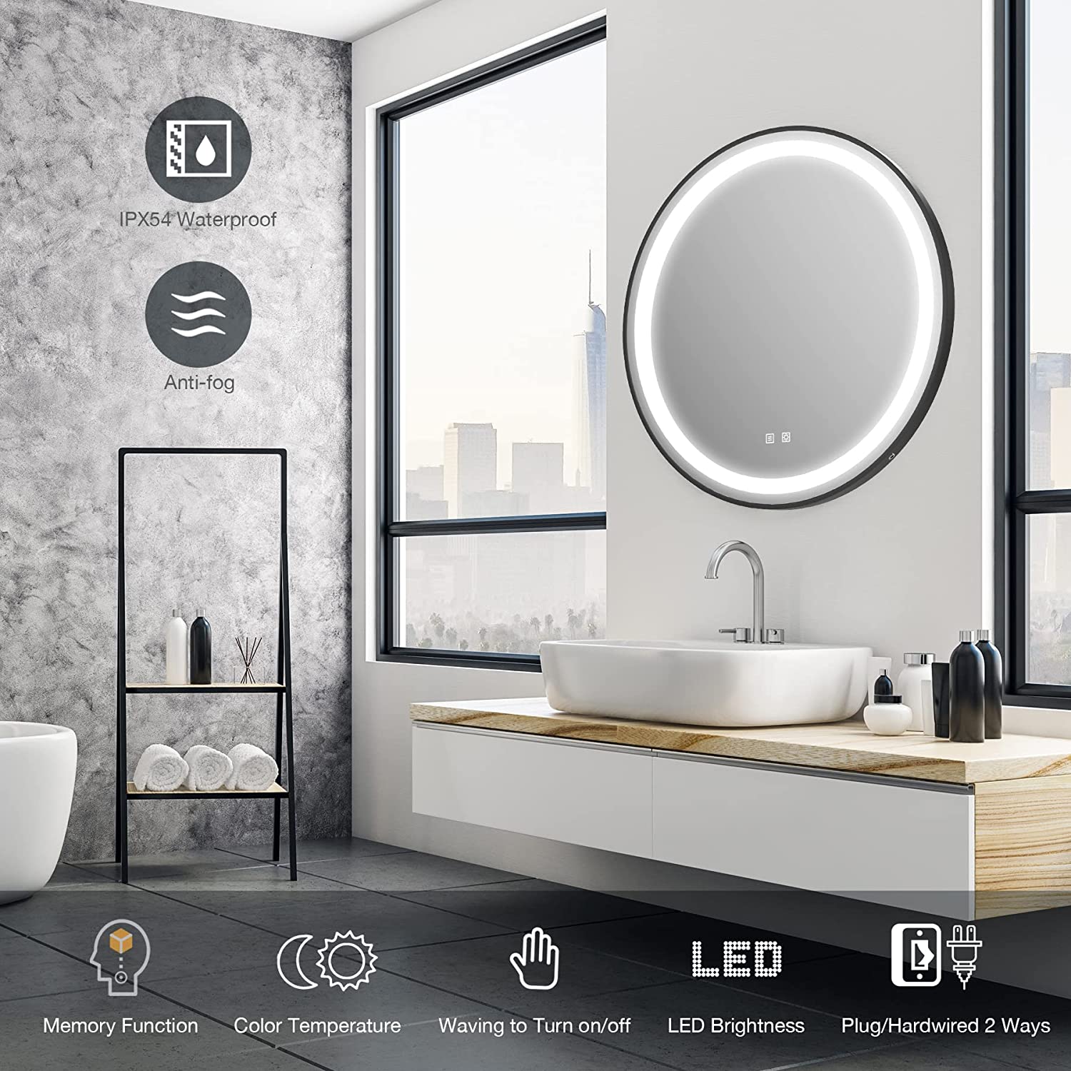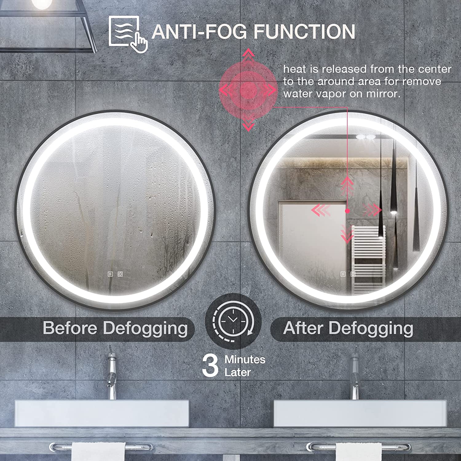 【Get Rid of the Fog and See Yourself More Clearly】Touch the anti-fog button on the round LED bathroom mirror and wait 3-5 minutes to see yourself more clearly. Heat is released from the center to the surrounding area to remove water vapor from the mirror. The smart memory function can save your last defogging and dimming without repeating the settings.
