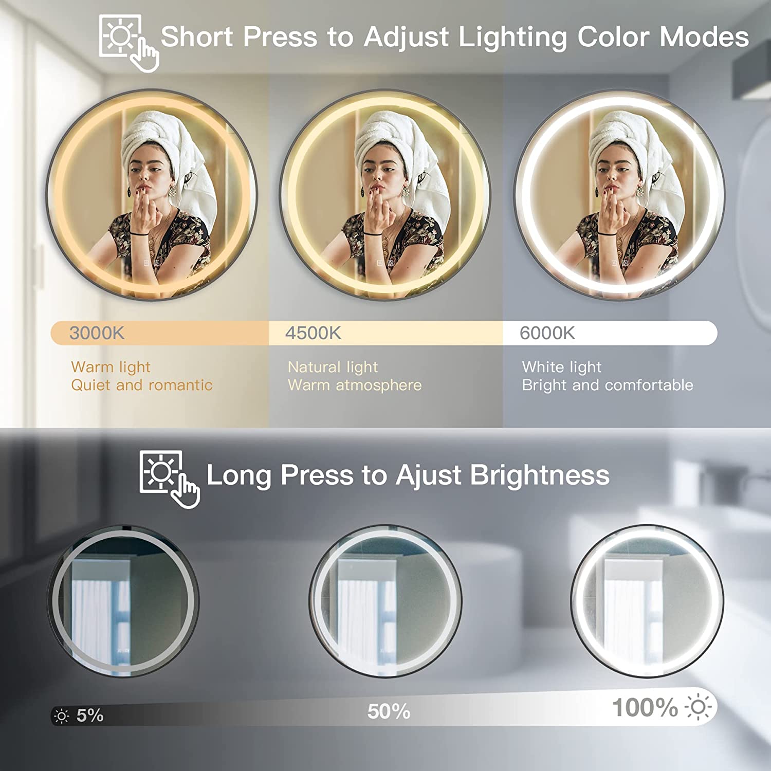 【Dimmable and Optional 3 Light Color Modes】2-in-1 touch button to meet the daily and makeup needs of your family: Long press to adjust the brightness to the brightest, short press to select warm/natural/white light from 3000k to 6000k. The round vanity mirror with lights can makes a difference to apply makeup. Our LED mirrors provide you with better lighting conditions, but not recommended as a stand-alone lighting tool, please use them with mirror lights or bathroom lights.