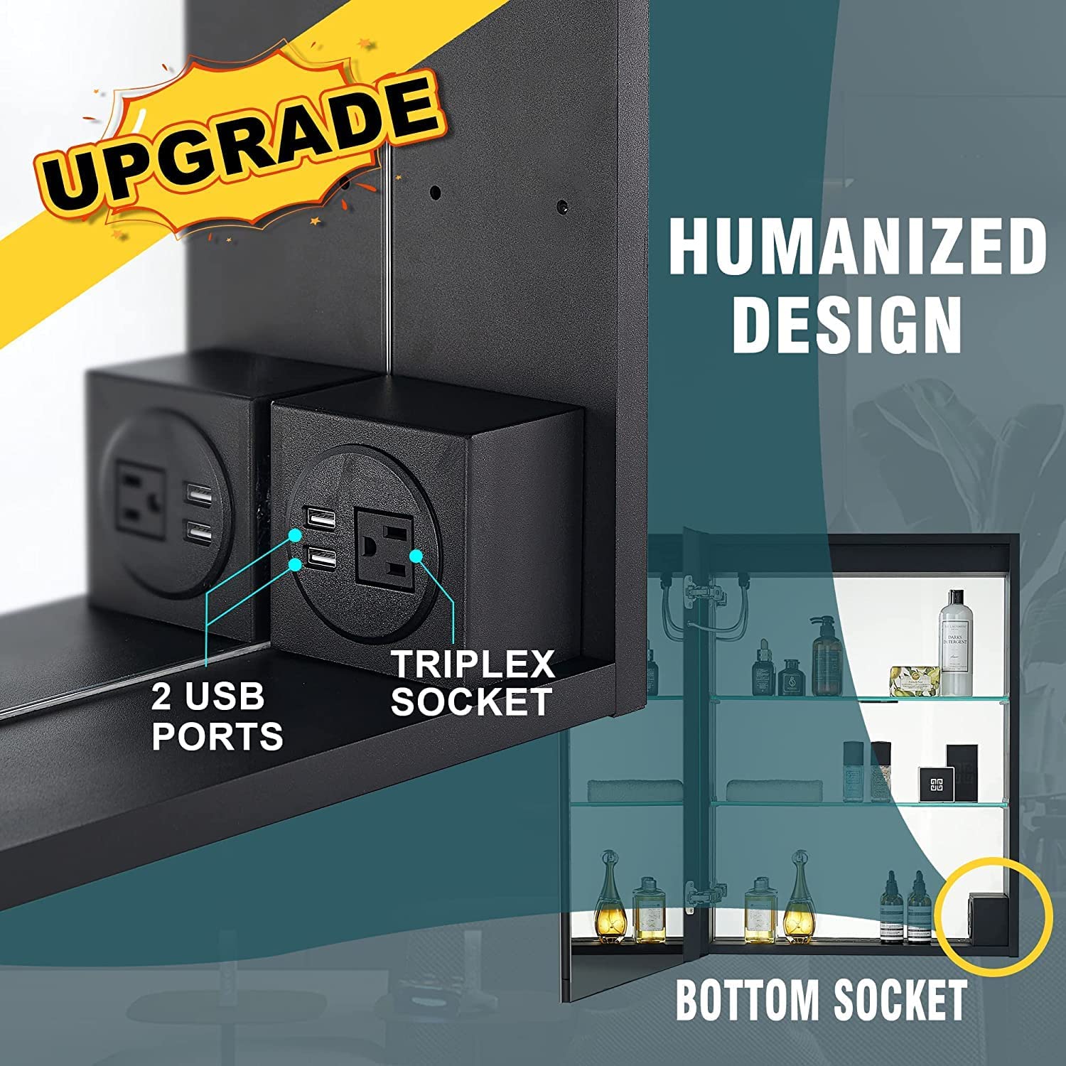 【Time Display & Sensitive Sensor】Adding digital clock to this led medicine cabinet is more convenient for you to control your time. Meanwhile, fast-response in 0.1 second touch sensors of the bathroom mirror with storage is not only handy to control even with wet finger but also obtain IP44 waterproof and UL certification for electrical components. Furthermore, charging outlet with dual USB ports & a triplex receptacle is positioned on the bottom board of the LED bathroom mirror cabinet.